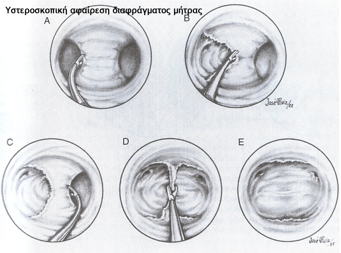 Προεγχειρητικά είναι απαραίτητος ο υπερηχογραφικός έλεγχος και μερικές φορές και η λαπαροσκόπηση. Συνήθως, μετά το χειρουργείο τοποθετείται σπιράλ χαλκού για μερικές εβδομάδες έτσι ώστε να αποφευχθούν οι συμφύσεις. Η αφαίρεση του διαφράγματος συμβάλλει στην αύξηση της γονιμότητας αφού κάνει την κοιλότητα της μήτρας φυσιολογικού σχήματος.